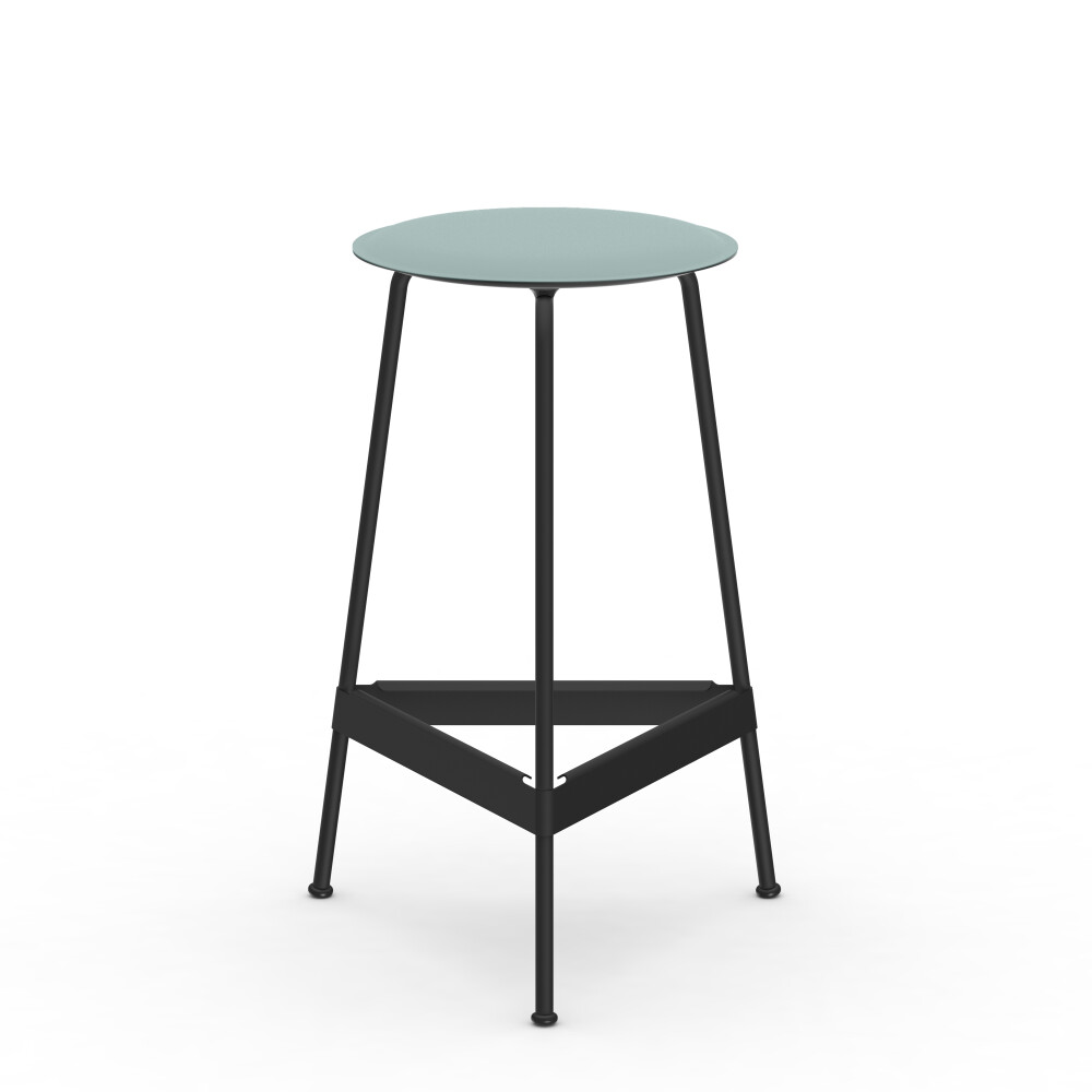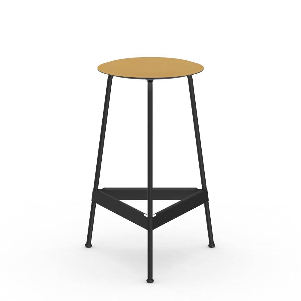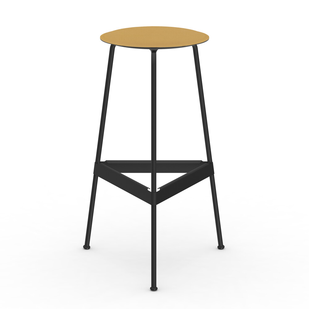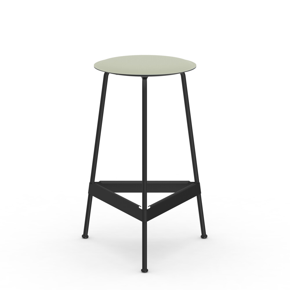 Sitzfläche aus Linoleum, Lederfaserstoff und Filz. Metallgestell aus pulverbeschichtetem Stahl. Montiert mit Gummigleitern.