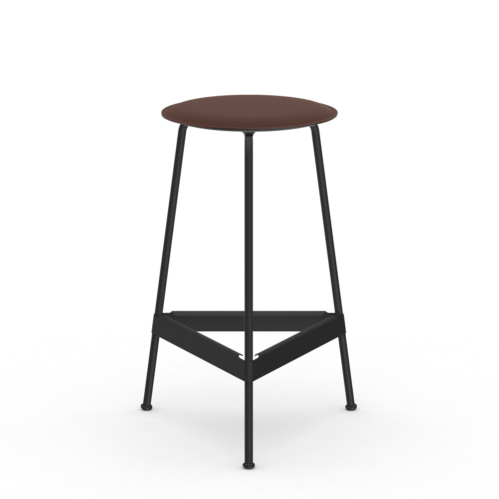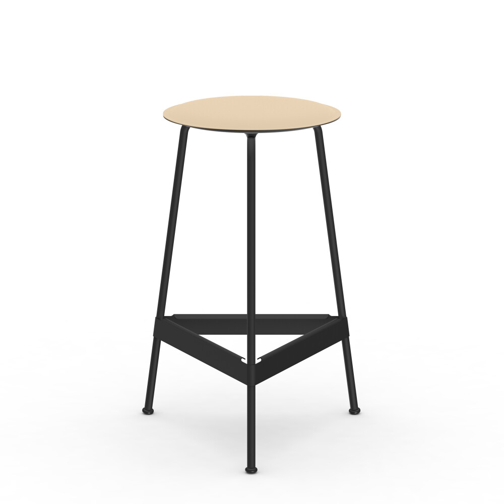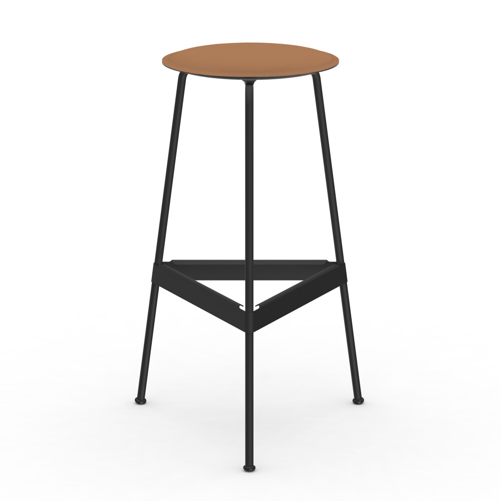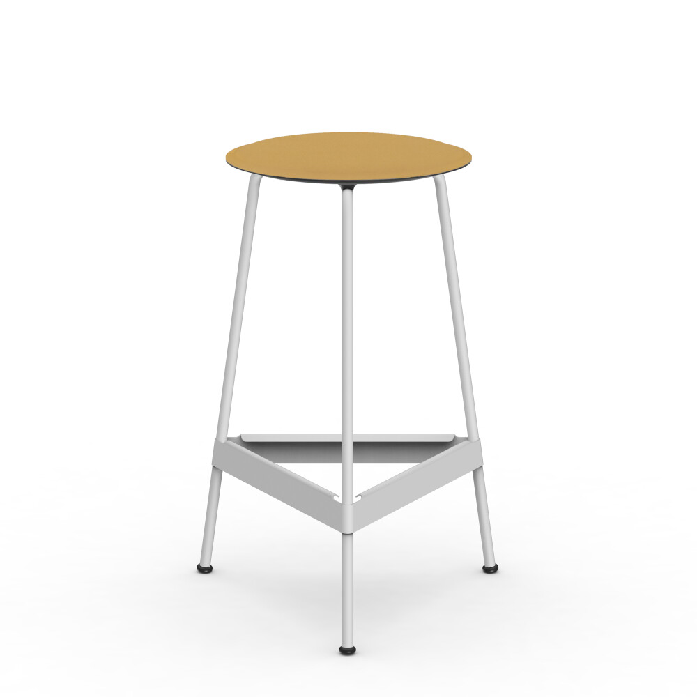 Sitzfläche aus Linoleum, Lederfaserstoff und Filz. Metallgestell aus pulverbeschichtetem Stahl. Montiert mit Gummigleitern.